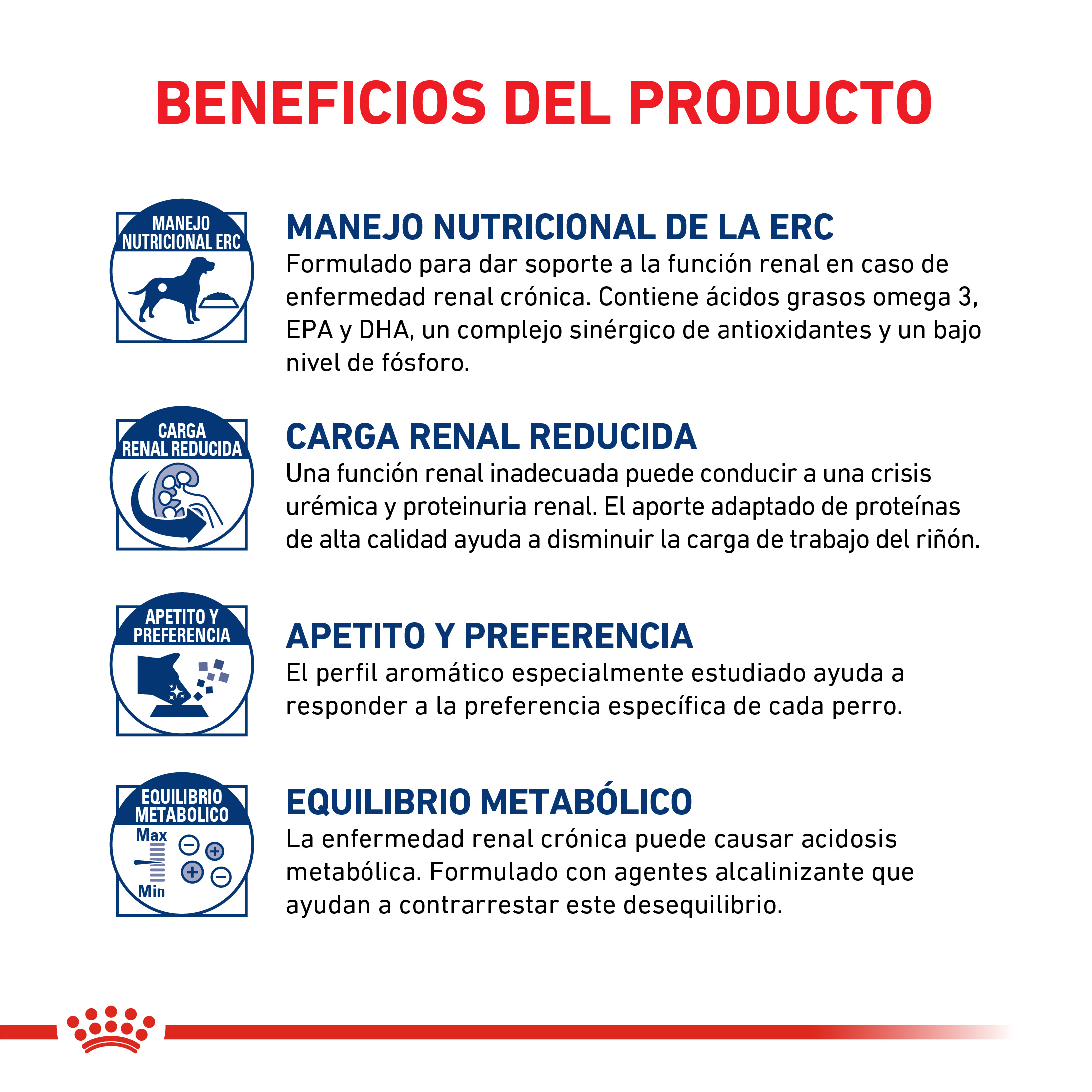 Alimento para perros adultos formulado para el soporte de la función renal en caso de insuficiencia renal crónica o aguda. Contiene un bajo nivel de fósforo y proteínas de alta calidad. Se recomienda consultar a un veterinario antes de su utilización.